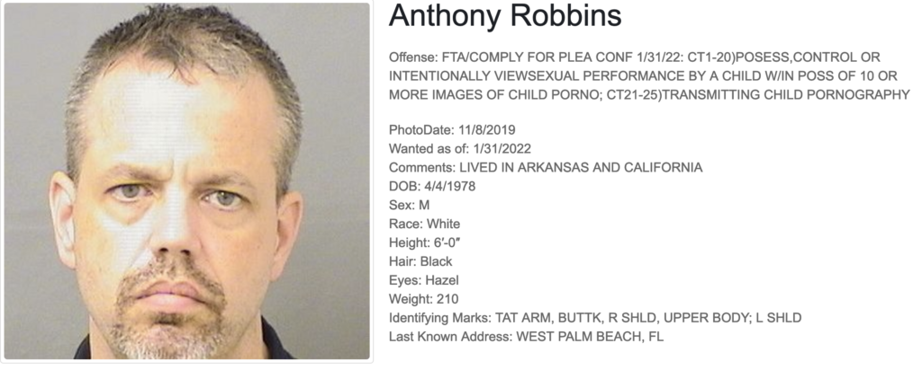 Additional information received about this despicable fugitive Anthony Ray Robbins reveals details of the search and arrest of this subject. As detailed in the public records of the Palm Beach County, Florida clerk’s office, upon executing a court authorized search warrant, the fugitive Anthony Ray Robbins was found to be in possession of multiple videos depicting child pornography. Specifically the report states the age range of the children in the videos “All of the videos depicted children ranging in age from approx. 2 years old to approx. 12 years’ old being sexually abused by various unknown adult males“.